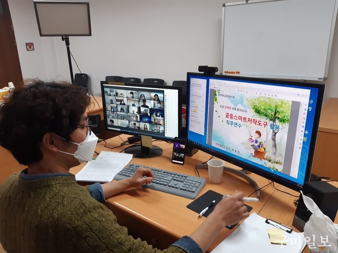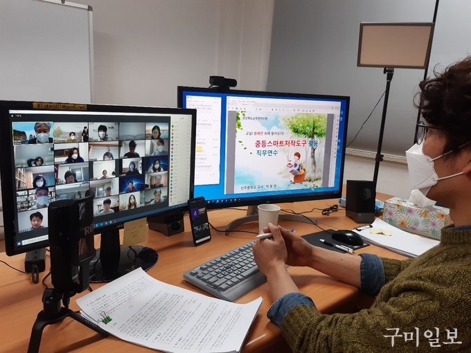 경상북도교육청연수원(원장 김옥례)은 뉴노멀시대 교사들의 다양한 교수-학습 프로그램 활용 능력 향상을 위해 2021년 2월 2일(화)부터 2월 3일(수)까지 2일간 중등교사 58명을 대상으로 ‘중등스마트저작도구활용 직무연수’를 실시하였다.