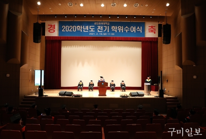 금오공과대학교(총장 이상철)가 2021년 2월 19일(금) 본관 대강당에서 ‘2020학년도 전기 학위수여식’을 개최했다. 학위 수여 인원은 학사 1,010명, 석사 114명, 박사 17명 등 총 1,141명이다.