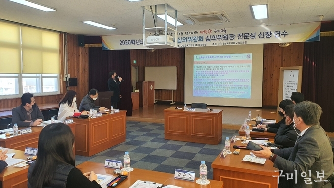 경상북도구미교육지원청(교육장 신동식)은 2월 19일(금) 오후 2시시부터 교장, 교감, 변호사 등으로 구성된 학교폭력대책심의위원회 심의위원장을 포함한 12명을 대상으로 코로나19 관련 방역지침을 준수한 가운데 학교폭력대책심의위원회 심의위원장 전문성 신장 연수회를 실시하였다.
