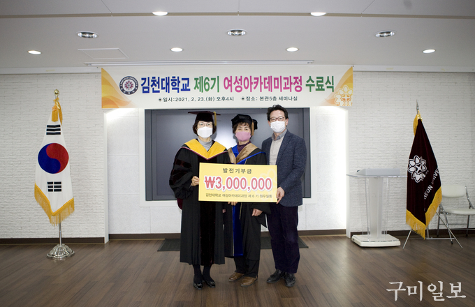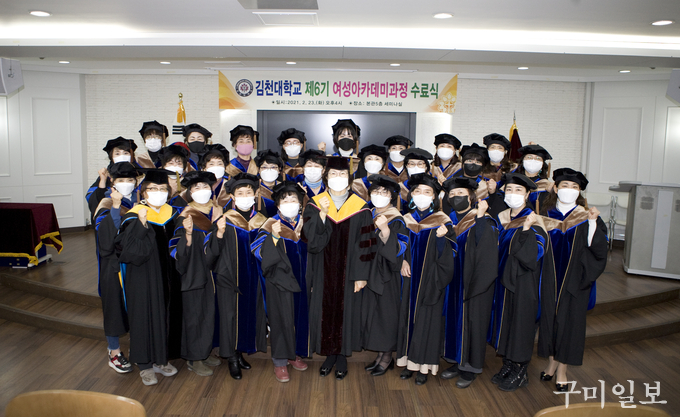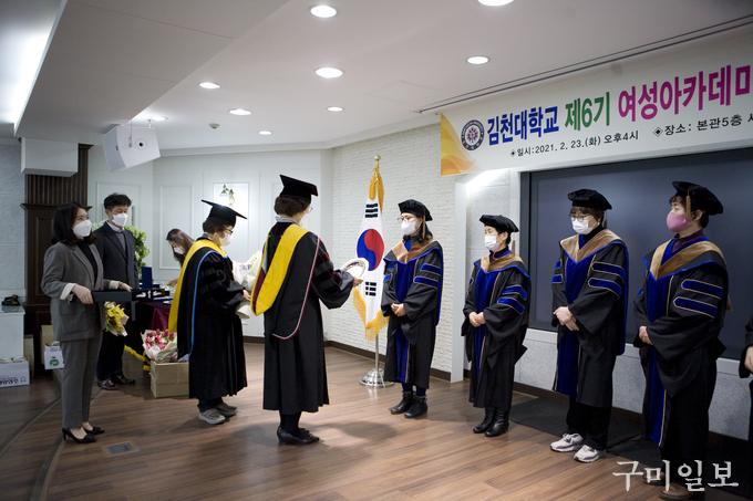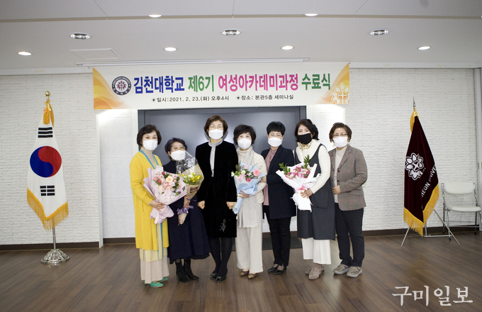 김은숙 총교우회 회장은 “코로나19로 인하여 행사나 모든 일정들이 원래 계획대로 잘 되지는 않았지만 그 어느 기수보다 단합이 최고인 6기 원우들의 수료를 축하한다. 1기~6기 여성아카데미 원우들이 김천대학과 김천시를 위해 앞장서 힘을 합할 수 있는 여성단체가 되도록 노력하겠다”며 수료생들에게 격려의 말을 전했다.
