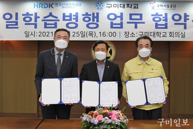 구미대학교 공동훈련센터(센터장 김정숙)가 2월 25일(목) 일학습병행 사업을 활용한 우수 인력 양성을 위해 한국산업인력공단 경북서부지사, 구미시설공단과 업무협약식을 가졌다.