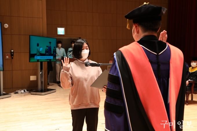 신입생 선서를 발표한 컴퓨터공학과 강윤지 학생은 “입학식에 많은 분들이 함께하지 못해 아쉬웠지만 개강 후 좋은 친구, 선배, 교수님들을 만날 것으로 기대하고 있다”며, “입학선서의 내용대로 대학생활도 열심히 하여 자랑스러운 금오인이 되겠다”고 말했다.