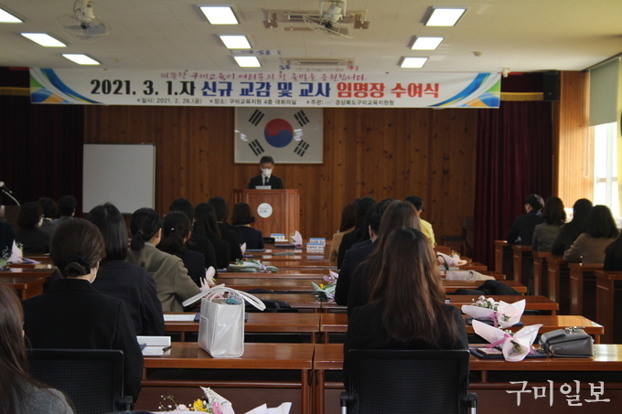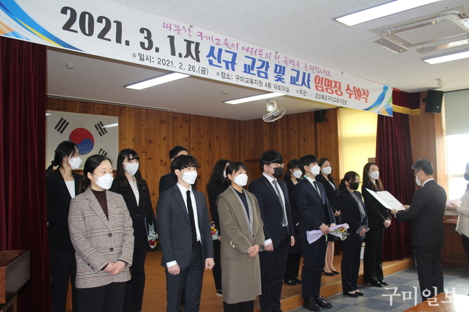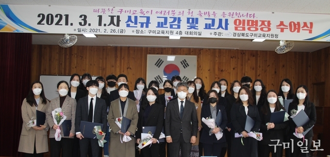 경상북도구미교육지원청(교육장 신동식)은 2월 26일(금) 오전 10시 30분 4층 대회의실에서 2021년 3월 1일자 유,초,중등 신규교(원)감 11명, 신규교사 51명 총 62명을 대상으로 임명장 수여식을 가졌다.