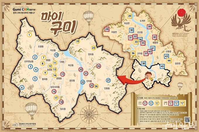 또한, 구미 창의체험지도(CRM)의 수업 활용도와 학생들의 구미 이해도를 높이기 위해, 활용 자료인 [마이 구미]를 추가로 제작하였다. [마이 구미]는 구미의 문화재와 시설을 역사전통체험, 자연환경체험, 교육문화체험 세 부분으로 나누고, 동지역과 읍·면지역으로도 나누어 수준별은 물론 부분적·통합적 학습이 가능하게 설계된 보드게임이다. 담임교사의 노트북 지원 및 교실 무선 인터넷 설치에 따른 도교육청 지원에 맞추어, 디지털기기에 친숙한 아이들이 QR코드로 위치와 문화재의 모습 등을 바로 확인할 수 있도록 하여 학생들의 눈높이를 맞추기 위해 노력하였다.