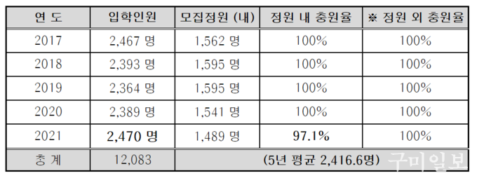 구미대의 경우 최근 5년간 연도별 입학생(정원 내, 외 포함)은 2364명에서 2470명 사이를 기록하고 있다. 학령인구 감소와 매년 모집정원이 축소되는 여건에도 불구하고 5년간 100명 내외로 입학생을 꾸준히 유지하고 있는 셈이다. 이는 지방 전문대로서 특성화된 경쟁력을 갖추고 있다는 반증이기도 하다.