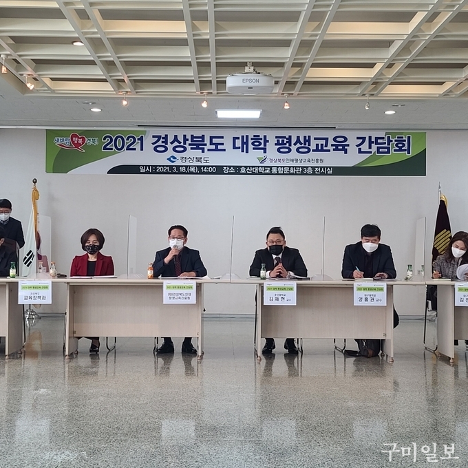 경상북도와 (재)경상북도인재평생교육진흥원은 지난 3월 18일(목) 호산대학교 통합문화관 3층 전시실에서 김재현 호산대학교 총장을 비롯한 도내 대학 평생교육 관계자 30여명이 참석한 가운데 간담회를 개최했다.