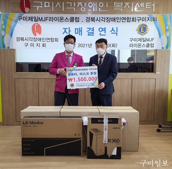 오늘도 구미제일 MJF 라이온스클럽은 컴퓨터 한대와 32인치 모니터, 그리고 마스크를 구미지회에 전달하였다.