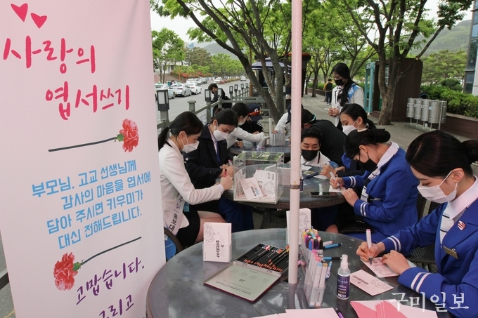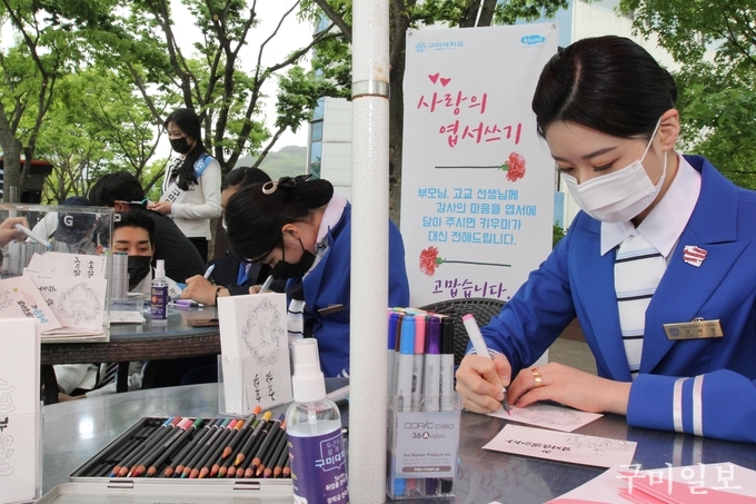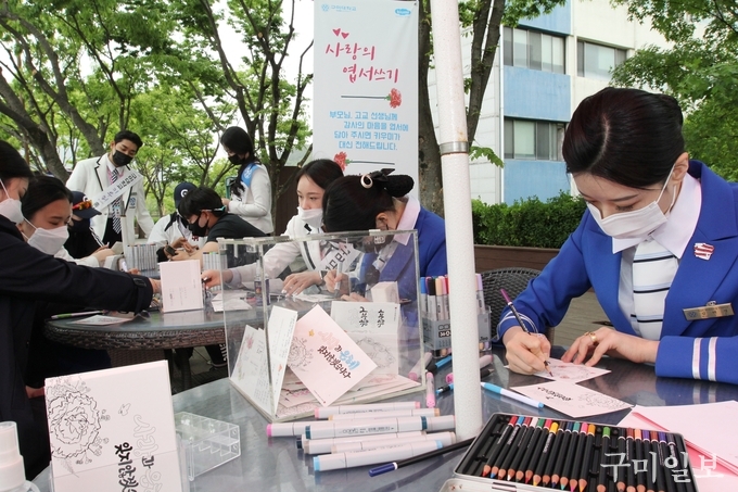 5월 가정의 달을 앞두고 구미대학교 홍보대사 ‘키우미’ 학생들이 4월 28일(수) 캠퍼스에서 ‘사랑의 엽서 쓰기’ 행사를 가졌다.
