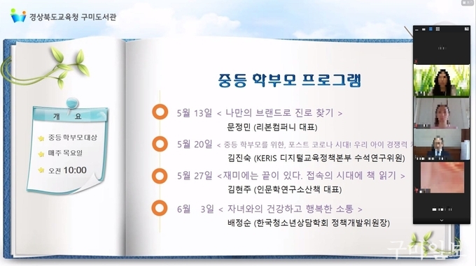 경상북도교육청 구미도서관(관장 배경규)은 지난 5월 6일(목) 오전 10시 실시간영상회의 프로그램을 통해 ‘2021년 미래 교육 학부모 아카데미’ 오리엔테이션을 운영했다.