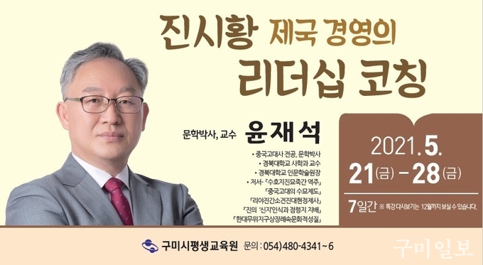 구미시평생교육원(원장 김용보)에서는 5월 21일 오전 9시 “진시황 제국 경영의 리더십 코칭”이라는 주제로 전국 국민이 언제 어디서 누구나 참여 가능한 비대면 온라인 특강을 구미시 유튜브 채널에 공개한다.
