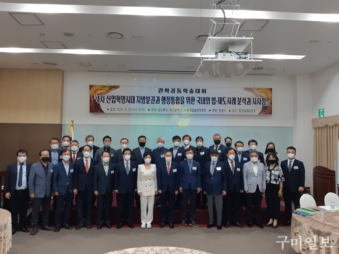 경상북도는 2021년 6월 23일(수) 문경새재리조트에서 (사)한국입법정책학회 주관 ‘4차 산업혁명 시대 지방분권과 행정통합’이라는 주제로 강성조 경북도 행정부지사, 채홍호 대구시 행정부시장을 비롯해 고우현 경북도의회 의장, 김안제 서울대 명예교수, 고문현 숭실대 교수, 장교식 학회장 등 50여명이 참석한 가운데 학술대회를 개최했다.