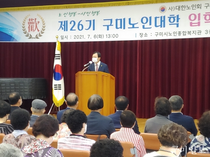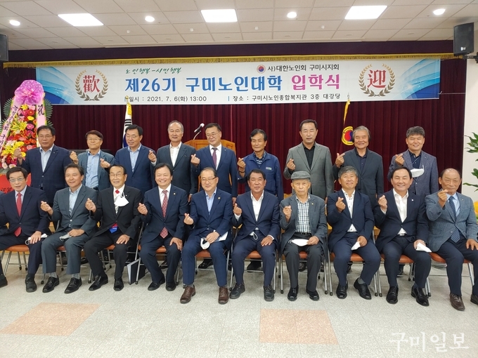 구미시(시장 장세용)는 2021년 7월 6일(화) 오후 1시 노인종합복지관 3층대강당에서 (사)대한노인회구미시지회(지회장 최경호) 주관으로, 노인대학생 100여명이 참여한 가운데 ‘제 26기 노인대학’ 입학식을 가졌다.