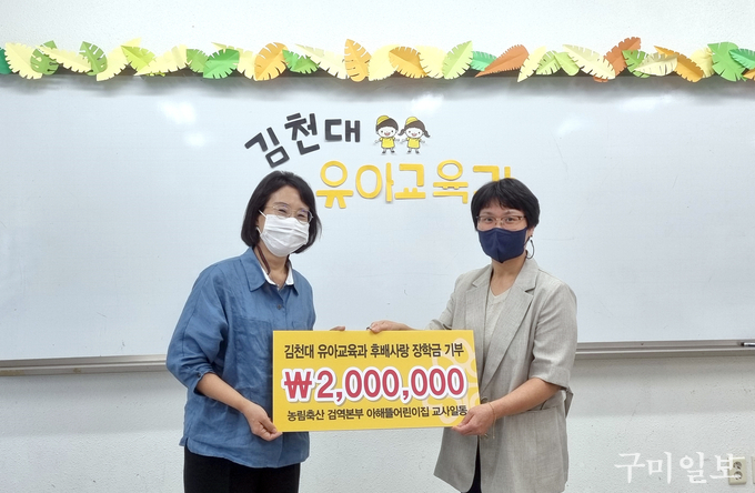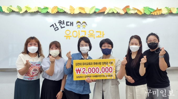 김천대학교 유아교육과에서는 지난 8월 23일(월) 김천대학교(총장 윤옥현)가 위탁운영하고 있는 농림축산검역본부 아해뜰 어린이집교사들이 방문하여 지역 유아교육의 발전을 위해 예비유아교사들의 장학금으로 200만원을 기부하였다.