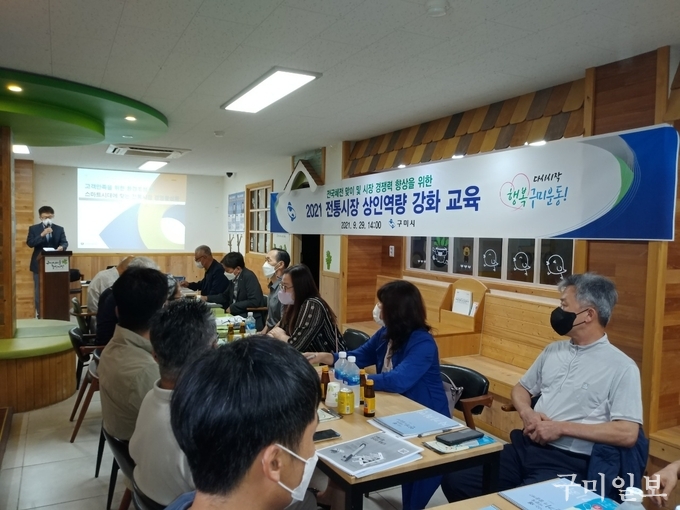 구미시(시장 장세용)에서는 2021년 9월 29일(수) 오후 2시, 구미새마을중앙시장 2층 중흥관에서 관내 16개 전통시장 상인 20명을 대상으로 전통시장 상인역량 강화 교육을 실시하였다.