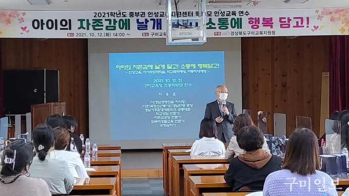 경상북도구미교육지원청(교육장 신동식)은 10월 12일(화) 구미교육지원청 4층 대회의실에서 「아이의 자존감에 날개 달고! 소통에 행복 담고」라는 주제로 2021 중부권 인성교육지원센터 학부모 인성교육 연수를 실시하였다.