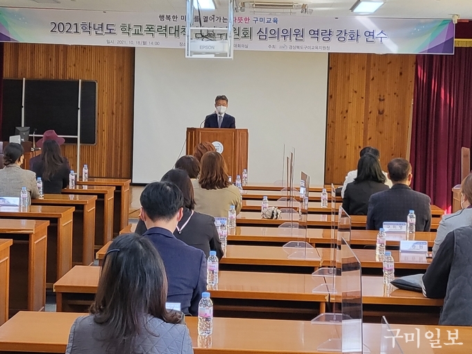 경상북도구미교육지원청(교육장 신동식)은 지난 10월 18일(월) 오후 2시 학부모, 변호사, 경찰, 전문가, 전·현직 교원 등으로 구성된 학교폭력대책심의위원회 심의위원 및 학교폭력 업무 담당자 등 72명을 대상으로 코로나19 관련 방역지침을 준수하여 학교폭력대책심의위원회 심의위원 역량 강화 연수회를 실시하였다.