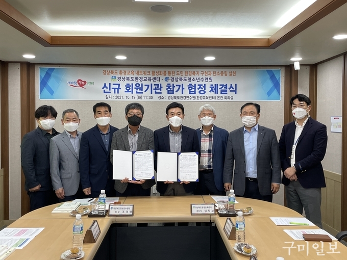 경상북도환경연수원(원장 심학보)에서 운영 중인 경상북도환경교육센터는 경상북도청소년수련원(원장 조경래)의 경상북도 환경교육 네트워크(GBEEN) 참가협정을 10월 19일(화) 오전 11시 30분 경상북도환경연수원에서 체결했다.