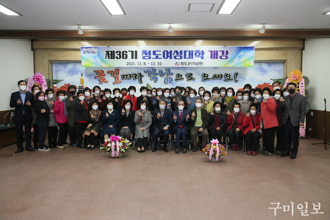 청도군(군수 이승율)은 지난 11월 8일(월) 각남면 면민회관에서 이승율 청도군수, 김수태 청도군의회 의장, 군의원, 여성단체협의회장, 여성대학동창회장, 여성대학 수강생 등 50여 명이 참석한 가운데 제36기 청도여성대학 개강식을 가졌다.