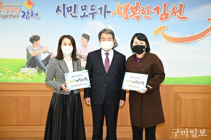 김천시(시장 김충섭)는 ‘2021년 베스트어린이집’으로 선정된 어린이집 2개소에 대해 지난 12월 9일(목) 상장 및 현판을 수여했다. 최우수상에는 율곡동 소재 아띠어린이집(원장 서미정), 우수상에는 율곡동 소재 율곡꼬마숲어린이집(원장 강미옥)이 선정되었다.
