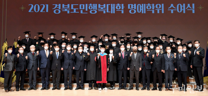 경상북도는 12월 21일(화) 도청 동락관에서 경상북도인재평생교육진흥원 주관으로 ‘경북도민행복대학 명예학위수여식’을 개최했다고 밝혔다.
