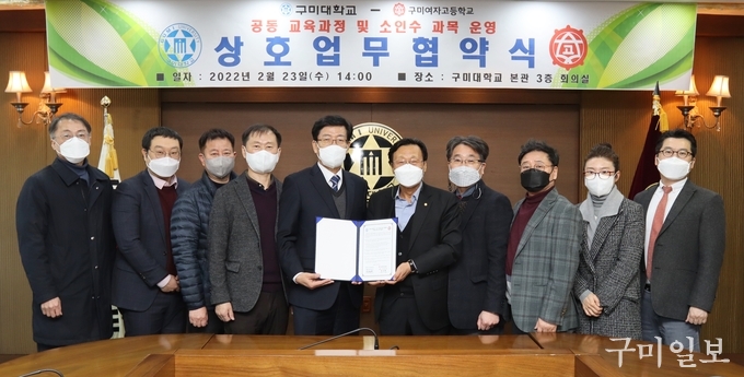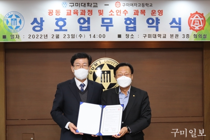 구미대학교(총장 장창주)는 2월 23일(수) 본관 3층 회의실에서 구미여자고등학교(교장 박성욱)와 공동교육과정 및 소인수 과목 운영 협력을 위한 업무협약식을 체결했다고 밝혔다.