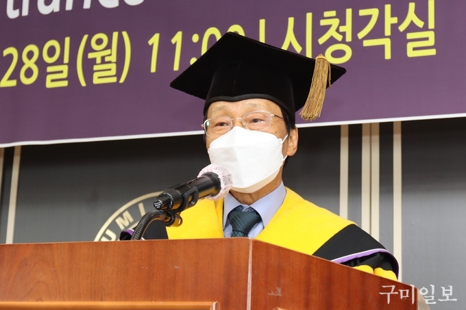 정창주 구미대학교 총장은 환영사에서 “코로나 환경이라는 특수한 상황이지만 수업결손 방지를 위한 대면과 비대면의 수업 전환을 통해 학생들의 학습권 보장에 최선을 다하겠다”는 약속을 하고 “꾸준히 노력하는 성실함과 창의적인 도전 정신 그리고 자신의 삶과 가치에 자부심과 긍지를 가진 멋진 대학생이 되어 달라”는 당부를 전했다.