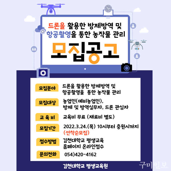 김천대학교(총장 윤옥현) 평생교육원(원장 김순희)에서는 경상북도 인재평생교육진흥원에서 주최하고 김천대학교 평생교육원에서 주관하는 2022년 경상북도 평생교육 특성화 지원사업 일환으로 「드론을 활용한 방제·방역 및 항공촬영을 통한 농작물 관리」 무료 교육생을 모집한다.