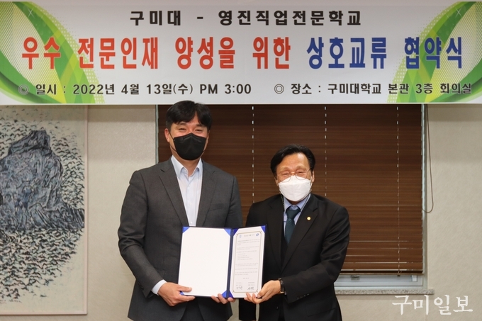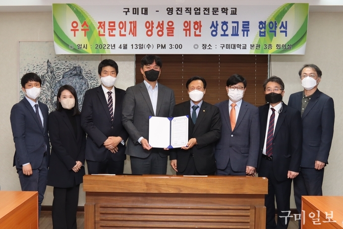 구미대학교(총장 정창주)는 4월 13일(수) 본관 3층 회의실에서 영진직업전문학교(이사장 곽승호)와 교육역량 강화를 위한 상호교류 협약식을 가졌다.