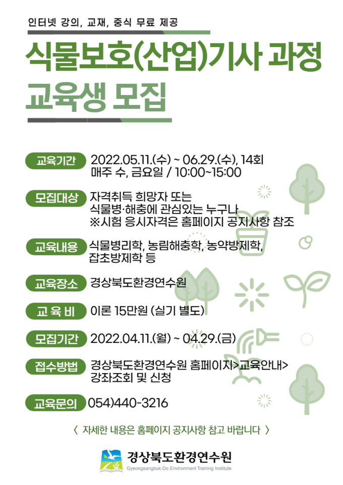 경상북도환경연수원(원장 심학보)은 식물 피해의 진단 및 방제를 전문적으로 할 수 있는 식물보호 전문가 양성을 위해 「식물보호(산업)기사 양성과정」교육생을 오는 4월 29일(금)까지 모집한다.
