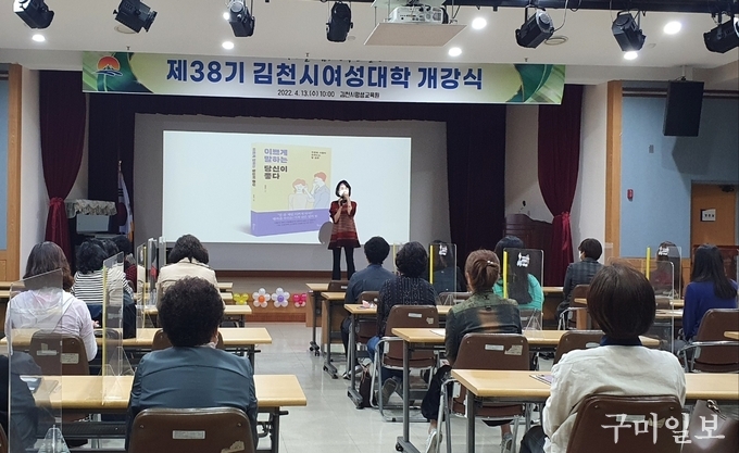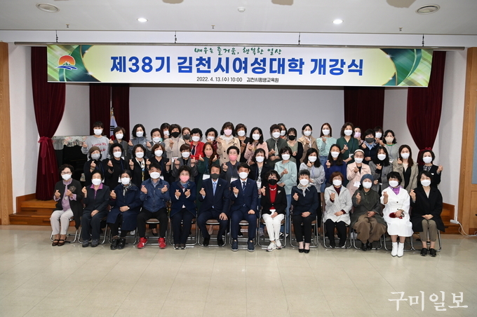 김천시평생교육원에서는 지난 4월 13일(수) 김일곤 부시장, 이우청 김천시의회의장, 나영민 부의장, 총동창회(회장 서지선)임원, 여성대학 수강생 등 90여 명이 참석한 가운데 『2022년 제38기 김천시여성대학』개강식을 가졌다.