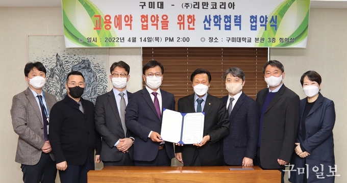 구미대학교(총장 정창주)는 4월 14일(목) 오후 2시 본관 3층 회의실에서 ㈜리만코리아(대표이사 김경중)와 맞춤형 전문인력 양성에 관한 고용예약 협약식을 체결했다.