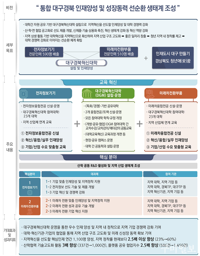 앞으로 5년간 국비 2320억원, 지방비 996억원(道498, 대구498)을 투입해 통합 대구경북 인재양성 및 지역산업 발전의 새로운 성장 동력을 마련할 계획이다.