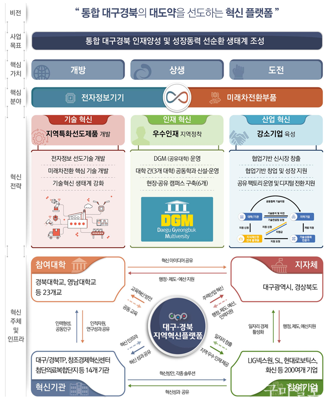 경북도와 대구시, 23개 대학, 14개 지역혁신기관, 200개 기업이 참여하는 이번 사업으로 지역의 핵심 산업인 ‘디지털 융합산업(전자정보기기, 미래차전환부품)’을 중점 육성할 수 있게 된다.