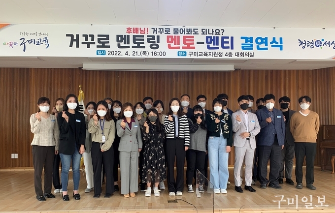 경상북도구미교육지원청(교육장 이성희)은 4월 21일(목) 구미교육지원청 대회의실에서 조직 구성원간 세대차이를 좁히고 유연한 조직 문화 조성을 위한 ‘거꾸로 멘토링 멘토-멘티 결연식’을 개최하였다.