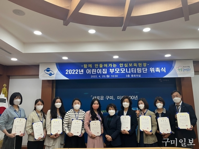구미시는 4월 25일(월) 오전 10시 30분 시청 중회의실에서 안심보육 환경 조성을 위한 「어린이집 부모모니터링단」위촉식을 가졌다.