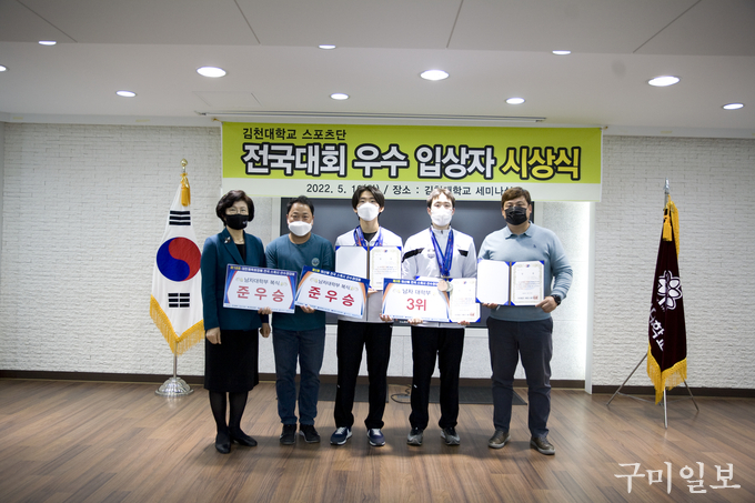 스쿼시부(감독 정창욱)는 지난 4월 24일 개최된 ‘제2회 태산배 전국스쿼시선수권대회’ 복식에서 이용정(항공호텔전공)·박민준(공연예술학부) 선수가 준우승을, 대학부 남자 단식에서 이용정 선수가 3위를 차지하는 쾌거를 이루며 2022년 김천대학교 운동부 첫 메달의 주인공이 되었다.