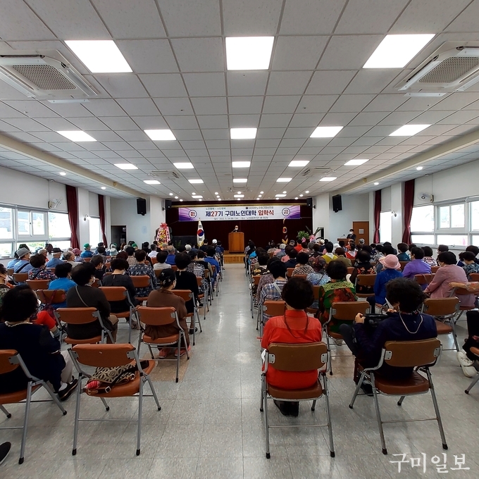 구미시에서는 지난 5월 24일(화) 오후 1시 노인종합복지관 3층 대강당에서 (사)대한노인회구미시지회(회장 최경호) 주관으로 학생 등 130여명이 참석한 가운데 제27기 구미노인대학 입학식을 개최했다.