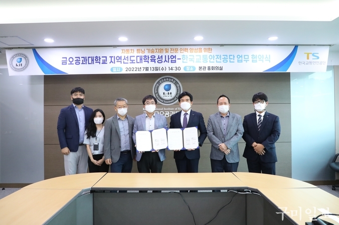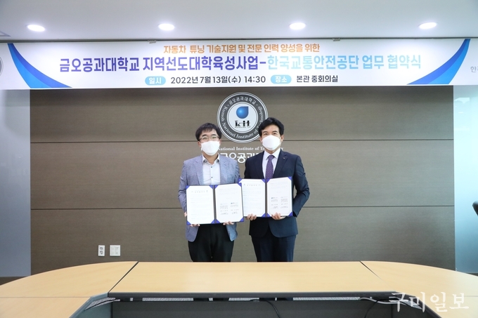 국립금오공과대학교 학생성공처(처장 이용환)와 한국교통안전공단 자동차검사본부 검사전략실(실장 오태석)은 7월 13일(수), 대학 본관 중회의실에서 자동차 튜닝 기술지원 및 전문 인력 양성을 위한 업무 협약을 체결했다.