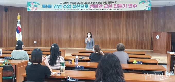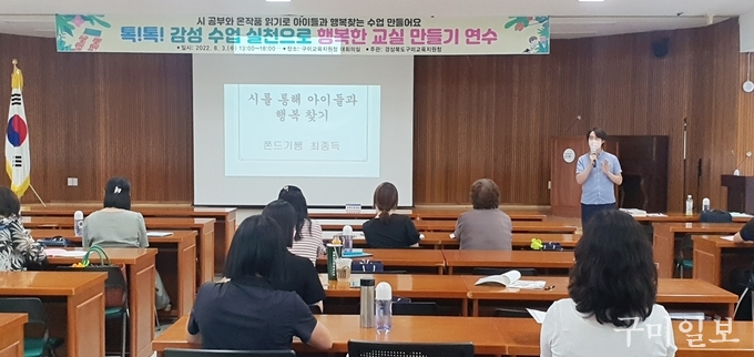 경상북도구미교육지원청(교육장 이성희)은 8월 3일(수) 구미교육지원청 4층 대회의실에서 초등교원을 대상으로 최종득 동시 작가와 이석선 인성 동화 작가를 초청해 시 쓰기와 온작품 읽기 지도법 연수를 실시하였다.