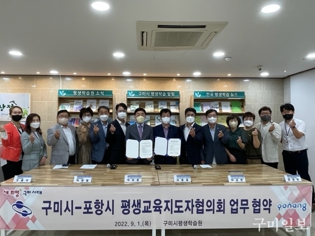 구미시평생학습원(원장 박영일)에서는 9월 1일(목) 오전 10시, 구미시평생교육지도자협의회(회장 박하용)와 포항시평생교육지도자협의회(회장 김용재)간 「마을 평생학습활성화를 위한 업무 협력 협약식」을 가졌다.