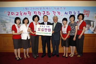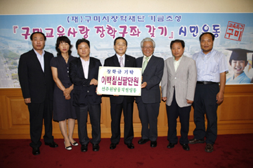 구미시민원실주부자원봉사회(회장 백동호)는 45명의 회원이 1일2명씩 교대로 민원실에서 민원안내도우미 활동을 하는 봉사단체로 회비를 절약하여 모은 50만원을 장학기금으로 기탁하였다.