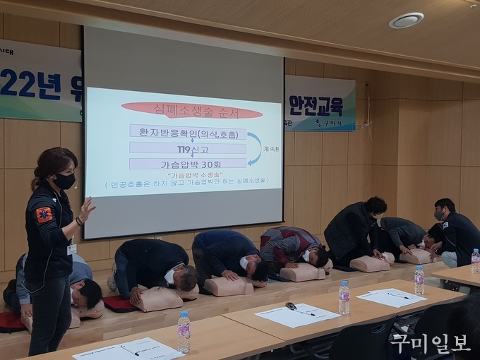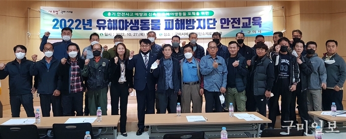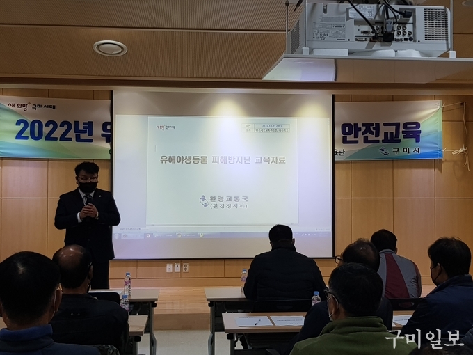 구미시(시장 김장호)에서는 지난 10월 27일(수) 오전 10시부터 구미시 탄소제로교육관 다목적실에서 유해야생동물 피해방지단원 30여 명을 대상으로 ‘2022년 유해야생동물 피해방지단 안전교육’을 실시하였다.