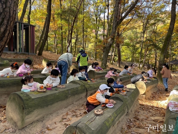 유아 숲 체험은 자연물로 가을 밥상 차리기, 도토리 굴리기 게임, 다람쥐․도토리 카드 뒤집기 게임, 밧줄 잡고 오르기, 그네 타기 등으로 이루어졌다.