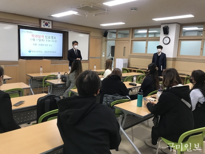 사곡고등학교(학교장 노순광)는 지난 10월 27일(목) 1학년을 대상으로 한 2022 학과탐색 진로캠프를 실시하였다. 미래와 비전 진로 캠프 강사 10분을 초청해 진행된 이 행사는 6시간에 걸쳐 진행되었으며 학생들은 흥미·적성에 기반한 직업 탐색 활동을 수행하고 다양한 학과의 미래 전망에 대한 정보를 제공 받아 현실감 있게 자신의 미래를 설계해 보았다.