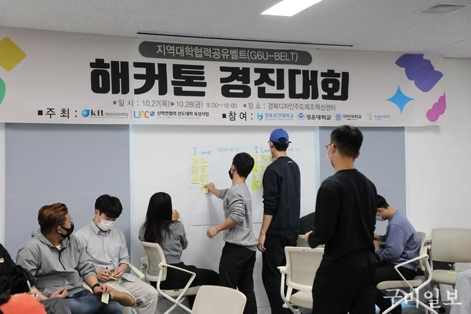 G6U-Belt에 참여하는 대학은 구미, 김천 지역의 금오공대, 경북보건대, 경운대, 구미대, 김천대, 한국폴리텍대학 구미캠퍼스 6개 대학이다. 이번 대회에는 각 대학 소속 학생 30여 명이 참여해 지역 및 지역기업에서 발생하는 애로사항에 대해 디자인씽킹을 통한 해결 방안을 모색하는 시간을 가졌다.