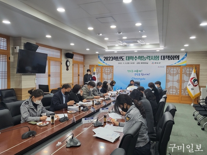 청도군(군수 김하수)은 지난 11월 8일(화) 군청 제1회의실에서 관련 부서, 유관기관 관계자 등 10여명이 참석한 가운데 2023학년도 대학수학능력시험 대비 종합대책 회의를 개최하였다.