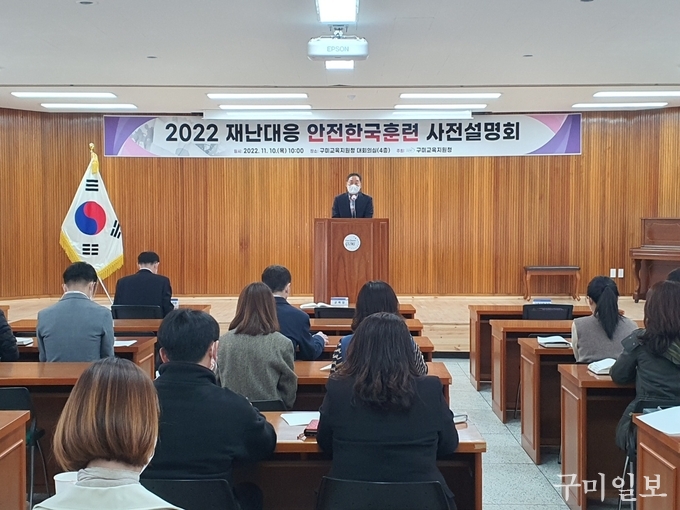 경상북도구미교육지원청(교육장 이성희)은 오는 11월 21일(월)부터 11월 25일(금)까지 5일간 진행되는 2022년 재난대응 안전한국훈련의 원활한 추진을 위하여 11월 10일(목) 교육청 직원들을 대상으로 설명회를 개최하였다.