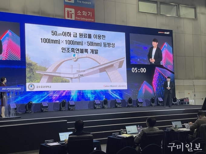 신소재공학과 대학원생으로 구성된 CML팀(지도교수 노재승, 박사과정 이상혜, 석사과정 고종환, 오세윤, 전동표)은 ‘50um이하급 원료를 이용한 100x100x50mm 등방성 인조흑연블록 개발’로 이번 수상의 영예를 안았다. 이 연구는 금오공대 신소재연구소에서 수행 중인 ‘이공분야 대학중점연구소지원사업’의 기초연구 성과를 바탕으로 한 산학프로젝트로, 등방성 인조흑연블록 개발 성과가 관계자들의 주목을 받았다.
