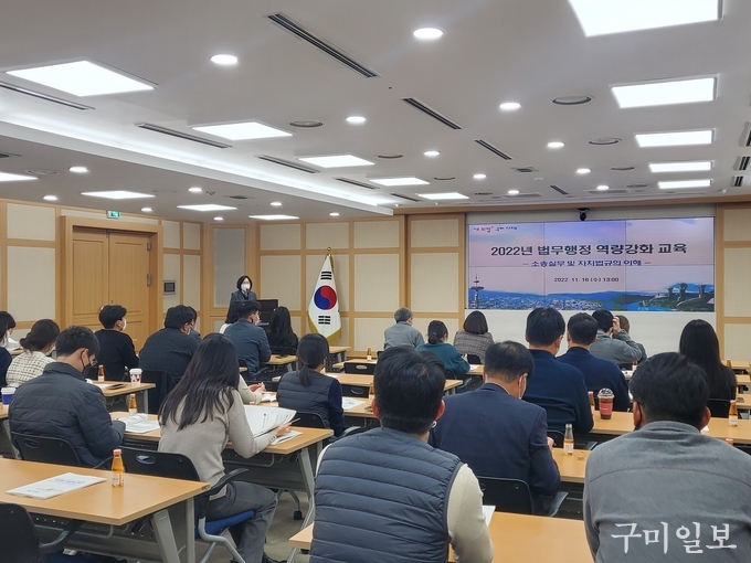 구미시(시장 김장호)에서는 2022년 11월 16일(수) 오후 1시 시청 3층 상황실에서 소송·법제 업무 담당자 60여명이 참석한 가운데 「2022년 법무행정 역량강화 교육」을 실시하였다.