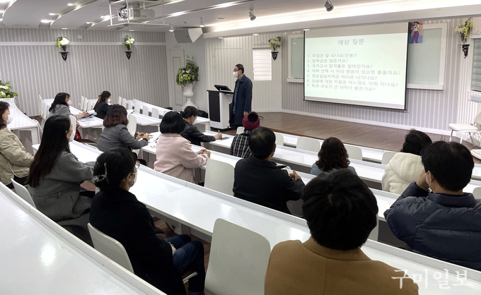 김천대학교(총장 윤옥현) 산학협력단(단장 백열선) 진로적성체험지원센터(센터장 류재기)에서는 지난 11월 28일(월) 오후 6시 30분 김천시 중∙고교생 학부모 23명을 대상으로 “우리 자녀 진로 찾기 학부모 특강”을 진행했다. 이번 특강에서는 “간호사의 전망과 김천대학교 간호학과”를 주제로 간호사에 대한 직업 소개 및 간호학과 진학을 위해서 필요한 입시 정보 등을 김천대학교 간호학과를 예를 들어 제공하였다.